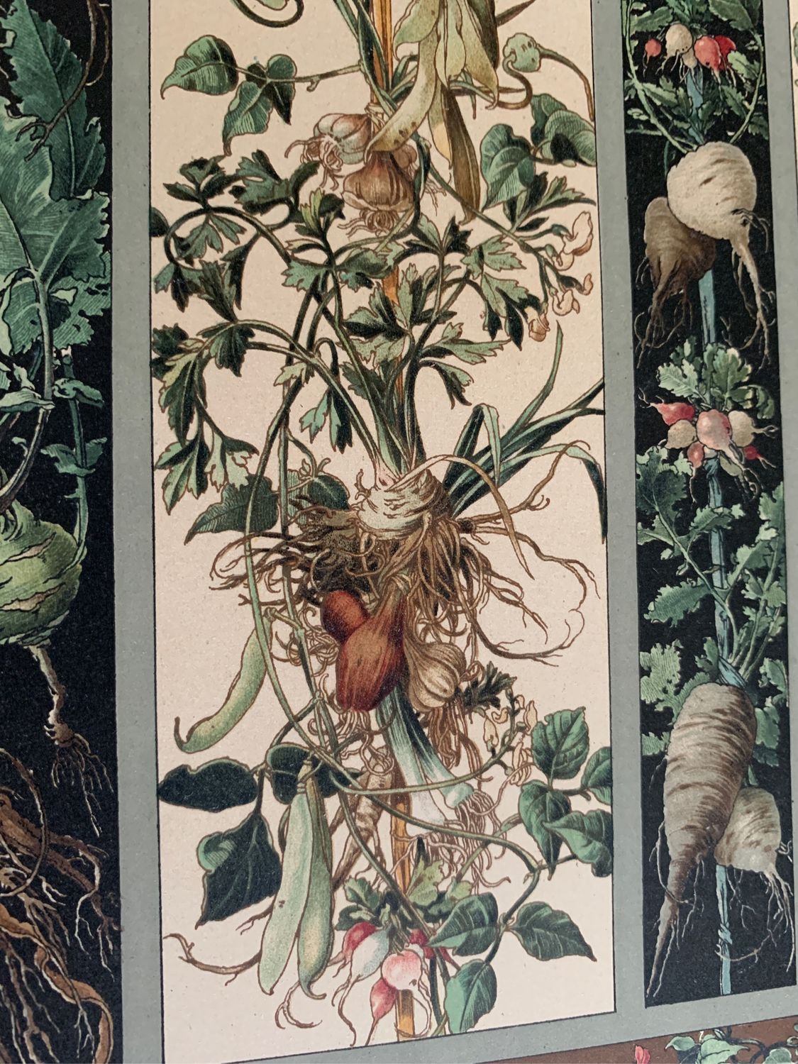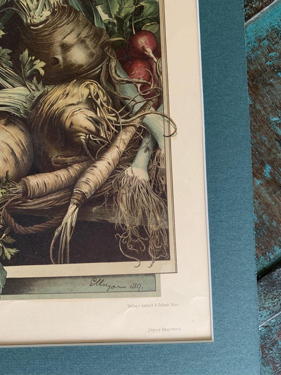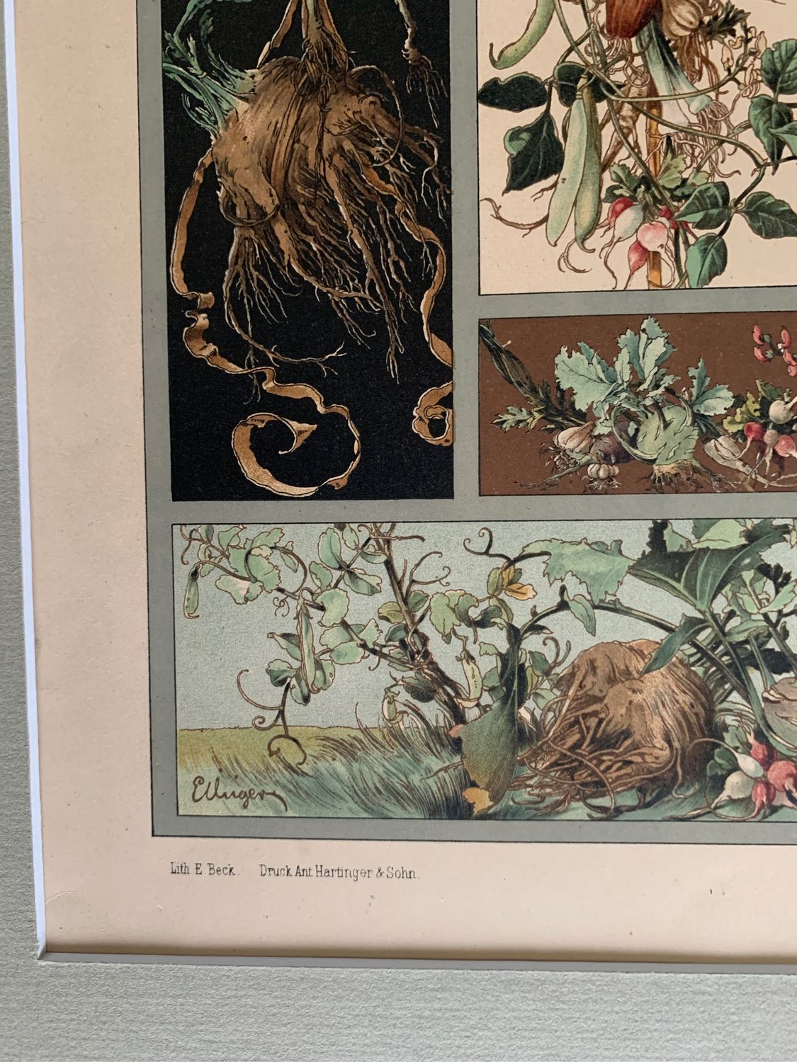 хромолитография E. Unger Else, Bohne, Sellerie, Rettich, Kohlrabi, Knoblauch